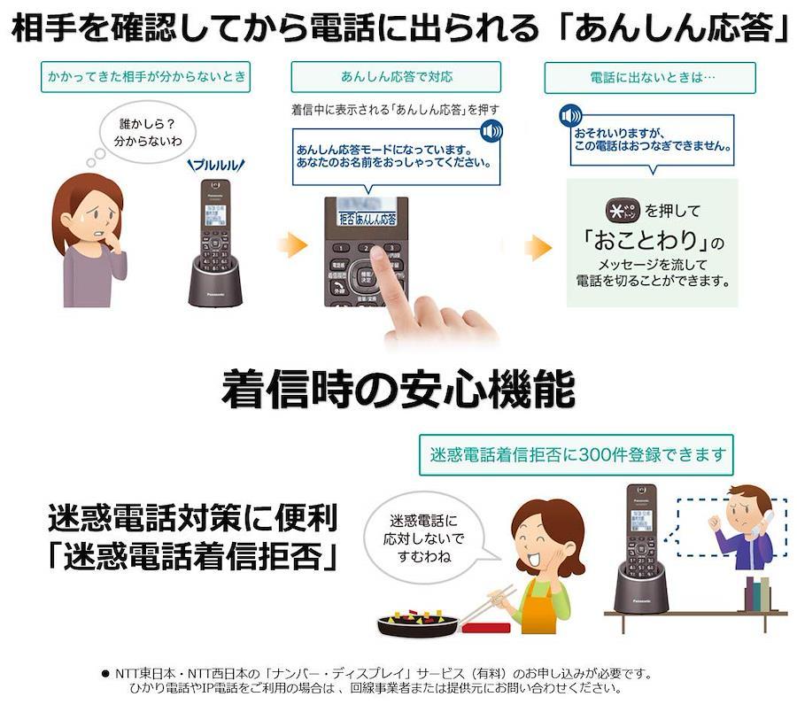 ※1 設定が必要です。ナンバー・ディスプレイサービスを利用している場合、付属の専用子機の電話帳に登録されていない相手からかかってきたときのみ迷惑防止の機能が働きます。