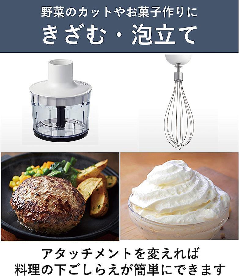 みじん切りから泡立てまで簡単に「チョッパー」「泡だて器」アタッチメント付き。