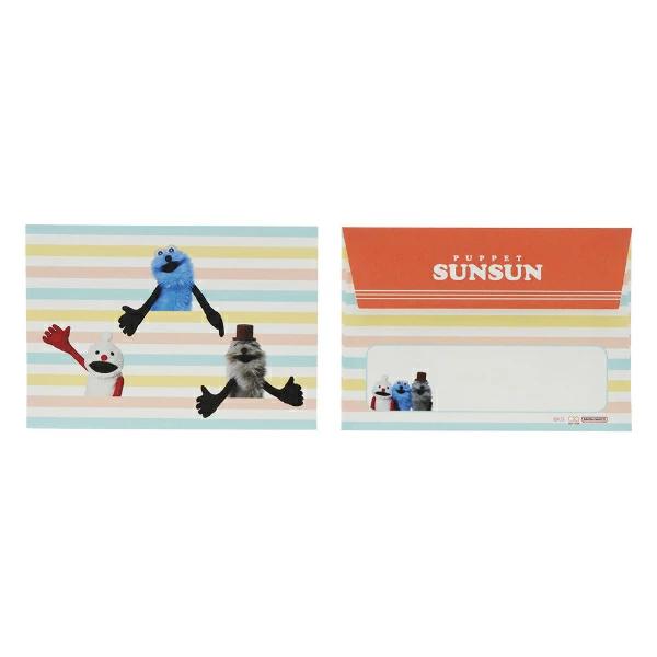パペットスンスンのダイカットミニレターセットです。便箋の表面には可愛い表情のスンスンがデザインされていて、裏面には文字が書き込めます!スンスン好きにはたまらない~♪愛らしいスンスンたちに癒されること間違いなしです☆【セット内容】便箋×5枚、封筒×5枚