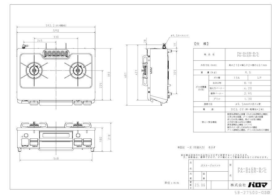ガス消費量:全点火時:8.10kW 強火力バーナー:4.20kW 標準バーナー:2.95kW グリル:1.30kW