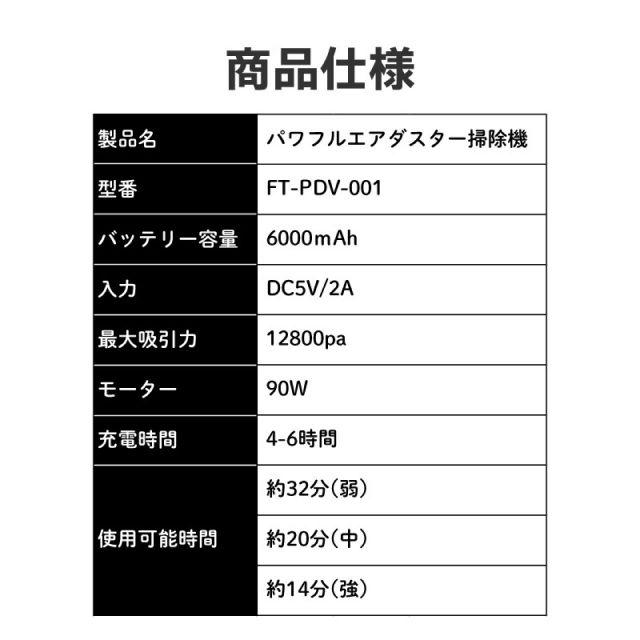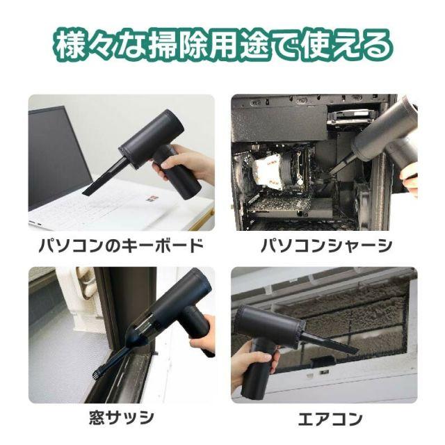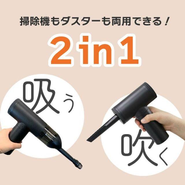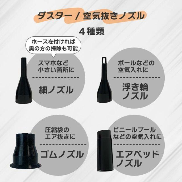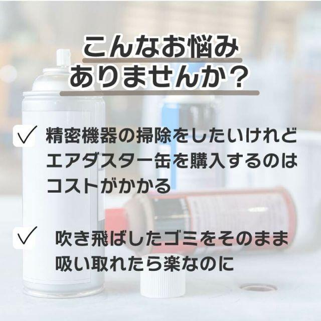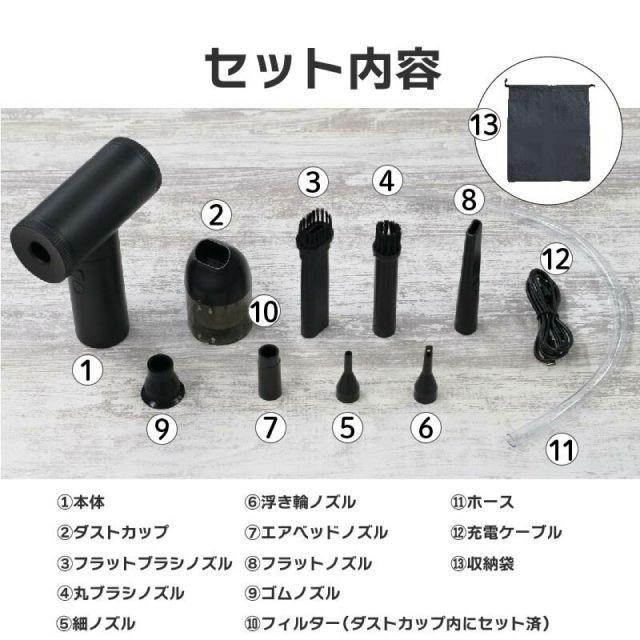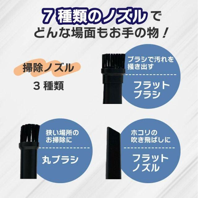 ◎エアダスターと掃除機が一体化になったアイテム!◎USB充電式で電池いらず。◎状況に合わせて3段階風速切り替えが可能。◎7つのノズルが付属しており様々な場面で使用できます。◎便利なコードレスだから、パソコンや車内の掃除、浮き輪の空気入れなど幅広く活躍!◎フィルターは水洗い可能。