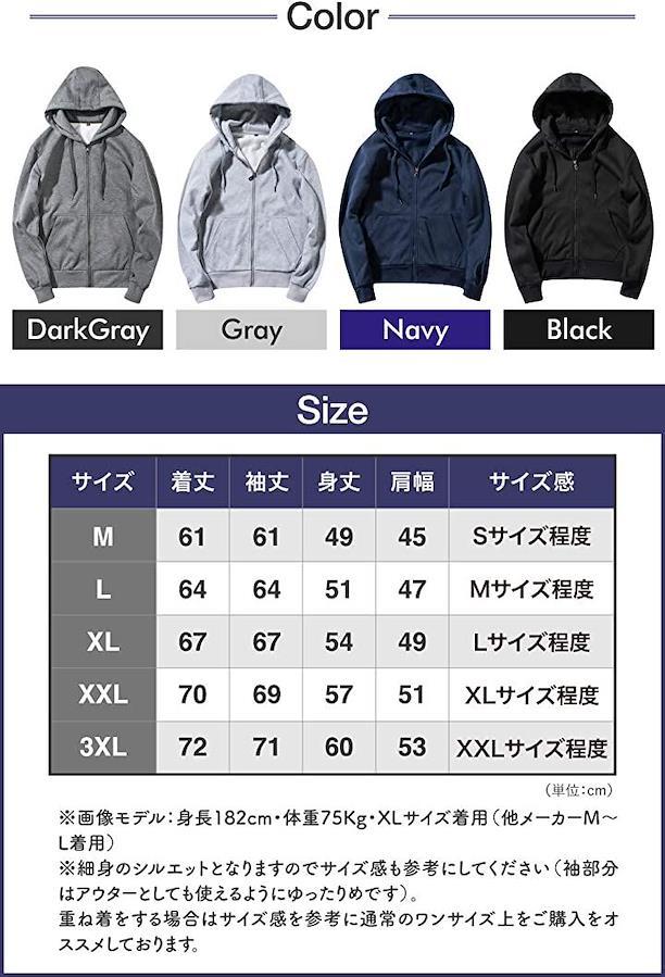 ・XXLサイズ:着丈約70cm・肩幅約51cm・身丈約57cm*3XLサイズ:着丈約72cm・肩幅約53cm・身丈約60cm*仕様:ポリエステルコットン素材、フード付き、ポケット付き、ジップトレーナー