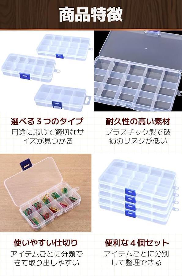 「商品特徴」(1)選べる3つのタイプ:用途に応じて適切なサイズが見つかる/(2)耐久性の高い素材:プラスチック製で破損のリスクが低い/(3)使いやすい仕切り:アイテムごとに分類できて取り出しやすい/(4)便利な4個セット:アイテムごとに分別して整理できる