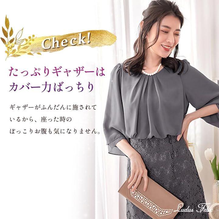 ふんわりとしたフレアスリーブと前身ごろの繊細なギャザーが、二の腕や上半身のラインを優雅にカバーし、どんな体型も美しく見せてくれます。
