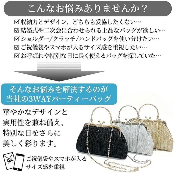 仕様1:シーンに合わせて使える3WAY仕様:クラッチ・ハンドバッグ・ショルダーバッグとして使い分けができる3WAYタイプのパーティーバッグです。