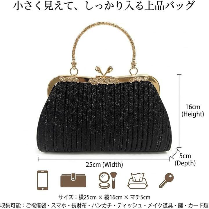 仕様3:見た目以上の収納力:コンパクトな見た目ながら、スマートフォン、ご祝儀袋、長財布、ハンカチ、リップなどの小物が収納しやすいサイズ感です。