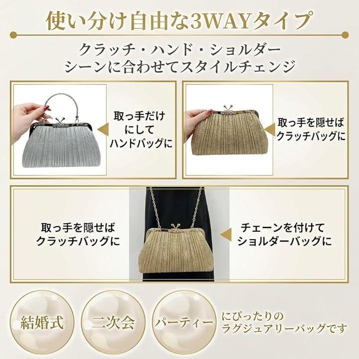 仕様1:シーンに合わせて使える3WAY仕様:クラッチ・ハンドバッグ・ショルダーバッグとして使い分けができる3WAYタイプのパーティーバッグです。