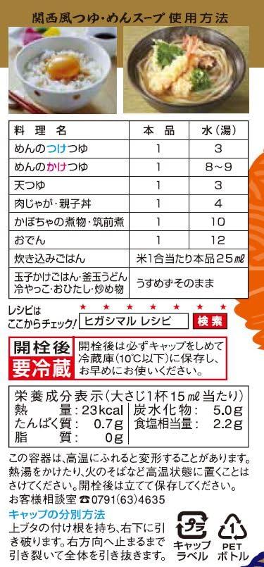 ヒガシマル醤油は天正年間から四百年以上にわたり醤油を造り続けております。当社の淡口醤油は素材の持味を生かすために開発された醤油で濃口醤油はくせのないおだやかなものでしょうゆのうまみを味わえます。また、原料にこだわり、地産地消を地元の契約農家とともにすすめております。めんつゆ・かけ醤油・煮物・炒め物に幅広く使える、鰹と昆布をきかせた関西風の4倍濃縮つゆです。