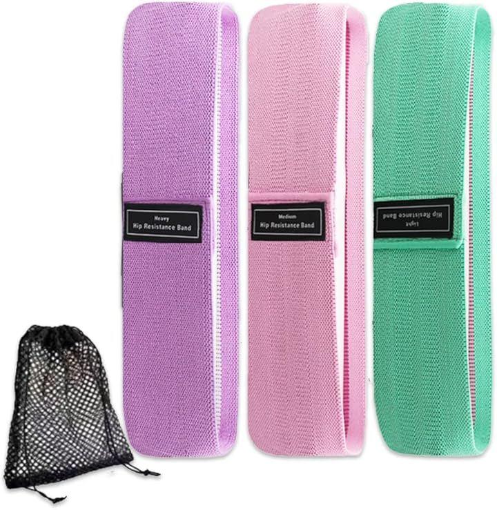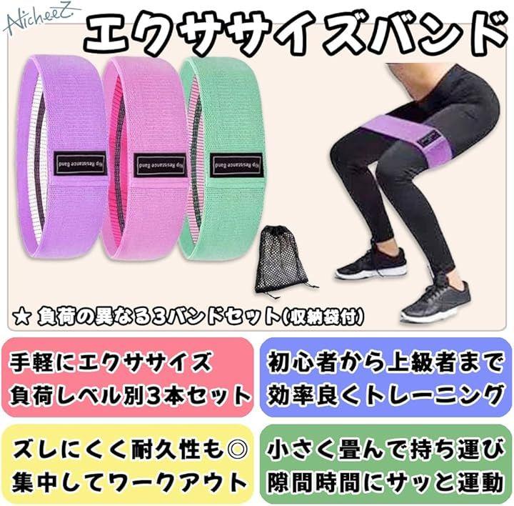 「商品内容」エクササイズバンド(負荷レベルの異なる3本セット) カラー:パープル(ヘビー),ピンク(ミディアム),グリーン(ライト) サイズ:幅/約8cm 周囲/約76cm 長さ/約41.5cm(パープル),約38cm(ピンク),32.5cm(グリーン) 収納袋付