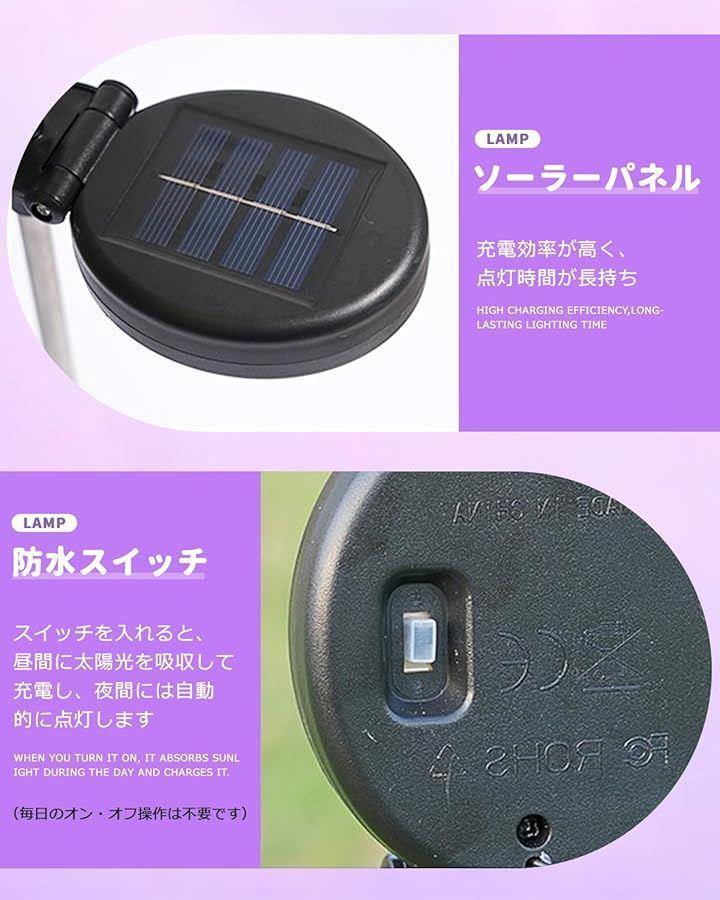 「電気代不要。高効率ソーラーパネル充電、自動点灯/消灯」昼間は太陽の光を効率よく吸収して充電し、夜になると自動的に点灯します。