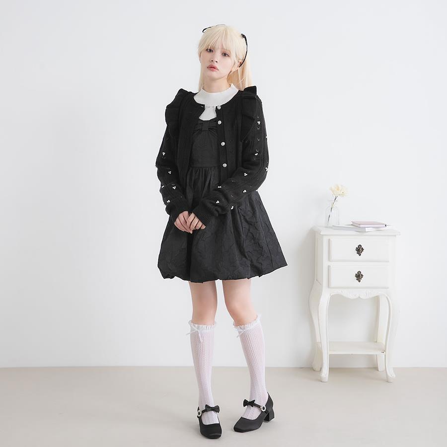 控えめなフリル、上品なパールビジュー釦、ハートに見える透かし編み、お袖のパール等、主役になりすぎずに細かいディテールにこだわって高見えするデザインにしました◎