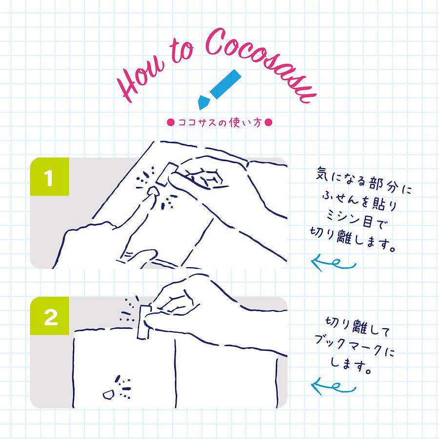 【切って離して貼れるふせん「ココサス」! 】気になるページにブックマークしたけれど、いざページを開くとどの情報が大切か忘れることも・・・そんな悩みを解消! 「ココサス」は、色や形でリンクするから大事な情報がひとめでわかる、新感覚のふせん!チェックしたいところに貼ったら、ミシン目で切り離し、長い方をページの端に貼ってブックマークに。ページを開けばマークした場所がすぐにわかる、便利なふせんです。地図やカタログにはもちろん、辞書やテキストにも最適。机に、ペンケースに、手帳に、あって便利なグッズです。