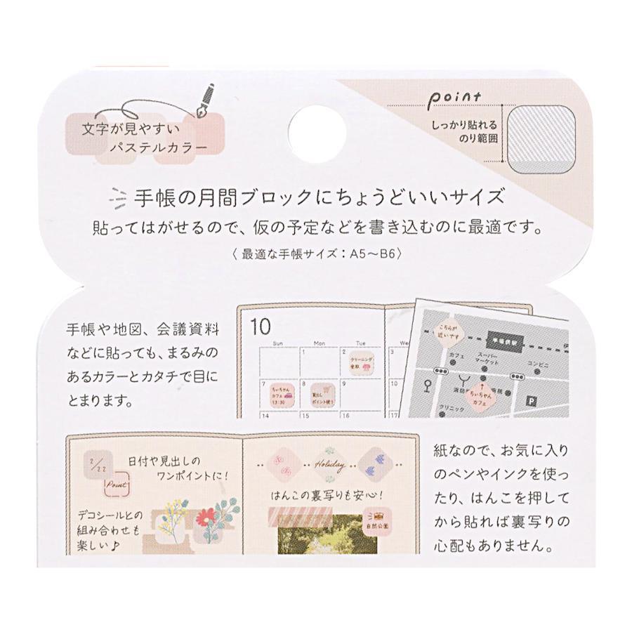 【まるみのあるカラーとカタチ。やさしく伝わるふせん】「まるみの」はシンプルで使いやすく、手帳に使ってもおしゃれにまとまるふせんです!プチサイズは手帳の月間ブロックにちょうどいいサイズで、貼ってはがせるので仮の予定などを書き込むのに最適です。情景をイメージさせるテーマカラー5色が1つに手帳デコでは、貼るだけで簡単におしゃれなデコができます。色の組合せ × 形の組合せ × 手持ちのシールやはんこで多彩なデコが楽しめます!自分使いはもちろん、相手使いも。おうちで・オフィスで・学校でもシーンを選ばず使える!使い勝手が良くやさしく伝わるふせんです。