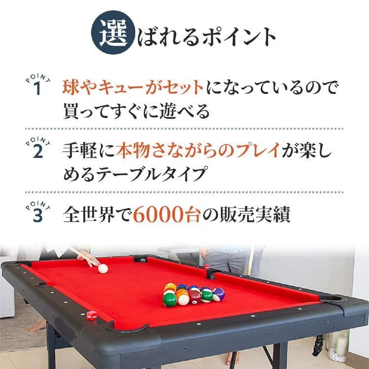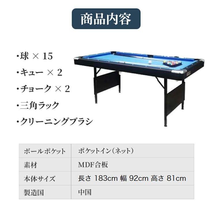 家庭で本格的なビリヤードが楽しめる!6フィートのビリヤードテーブルです。 お店と同じように本格的なビリヤードを家庭でも楽しみたい、家庭でビリヤードの練習がしたいという方に選ばれています。 球やキューがすべて揃ったせっとになっているので、荷物が届けばすぐに本物さながらのプレイを楽しむことができます。 全世界で6000台の販売実績のあるモデルなので安心感があります。 商品内容 : テーブル、球、キュー、チョーク、三角ラック、クリーニングブラシ サイズ 長さ 193cm x 幅 109cm x 高さ 79cm 、ボールポケット(カラーはホワイトに変更になりました) : ポケットイン 、素材 MDF合板 、中国製 カラー : レッド、グリーン、ブルー、ブラック 組立には特殊な工具は不要です。テーブルの脚を起こして設置するだけの単純な作業で始めることができます。※重量と大きさがあるため 一人では設置はできません。商品の開梱から設置は必ず大人2名以上が必要です。 梱包サイズは 200 x 120 x 13cm 68kg です。 搬入経路(ドア幅、エレベーター、階段)によっては通路が通らない場合もありますので 事前に必ずご確認ください。 ※輸入品のため、ダンボール箱は破れ、へこみ、汚れがございます。ご了承ください。本体に問題はございません。特大サイズの荷物のため、配達日時の指定はできません。ご了承ください。 1F 玄関でのお渡し となります。また配達の際に、荷降ろしをお客様にお手伝いいただく場合がございます。ご協力のほどよろしくお願いします。 別料金にて商品の開梱から設置まで行うサービスを提供しております。設置場所をドライバーにお伝えいただきましたら開梱して設置までを させていただきます。※ドア幅、エレベーター、階段を通ることが不可能の場合は設置、配達作業ができませんので事前のご確認をお願いいたします。 設置サービスは 15,000円(北海道・沖縄離島を除きます。) 北海道 20,000円 、沖縄離島 30,000円 となります。 家庭で本格的なビリヤードが楽しめる!6フィートのビリヤードテーブルです。 球やキューがすべて揃ったせっとになっているので、荷物が届けばすぐに本物さながらのプレイを楽しむことができます。 商品内容 : テーブル、球、キュー、チョーク、三角ラック、クリーニングブラシ サイズ 長さ 183cm x 幅 92cm x 高さ 81cm 、ボールポケット : ポケットイン 、素材 MDF合板 、中国製 組立には特殊な工具は不要です。テーブルの脚を起こして設置するだけの単純な作業で始めることができます。※重量と大きさがあるため 一人では設置はできません。商品の開梱から設置は必ず大人2名以上が必要です。 カラー : レッド、グリーン、ブルー、ブラック