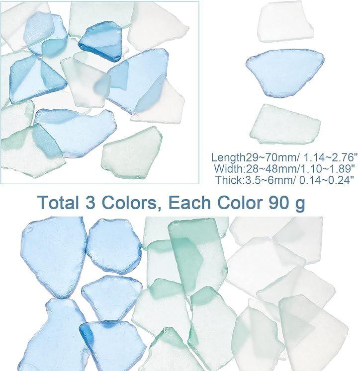 セット内容:ブルー、マットホワイト、ミディアムシーブルーのシーグラス270g入り、90g/カラー、シーグラスは鏡やフォトフレームなどを飾る装飾材料として使用することができます。