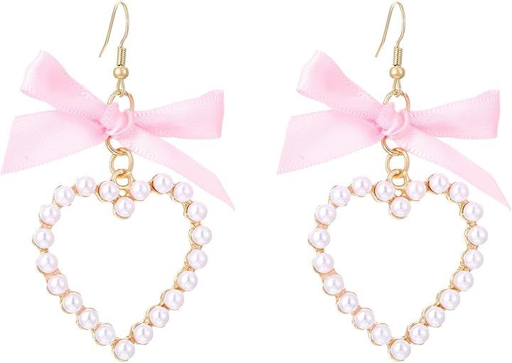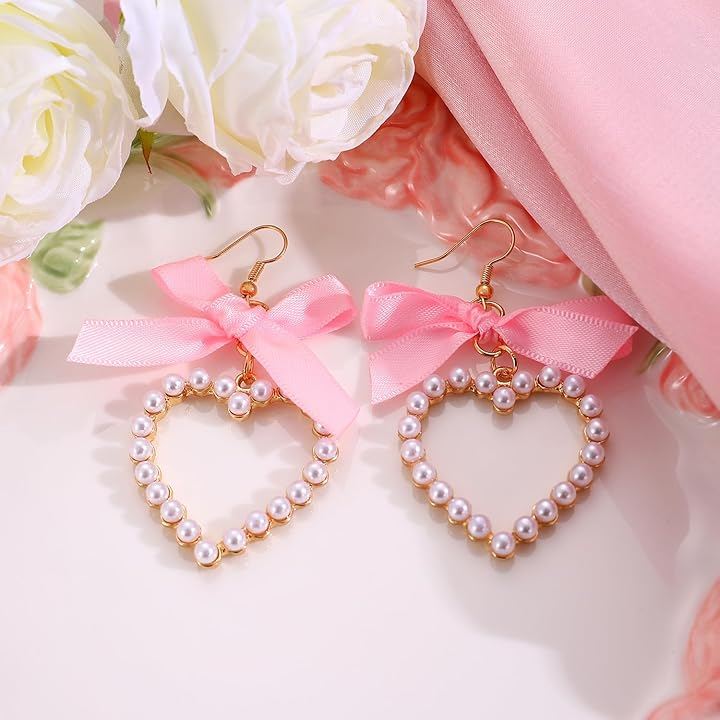 リボンモチーフが耳元を優しく彩り、動くたびに揺れるハートが女性らしさを引き立てます。