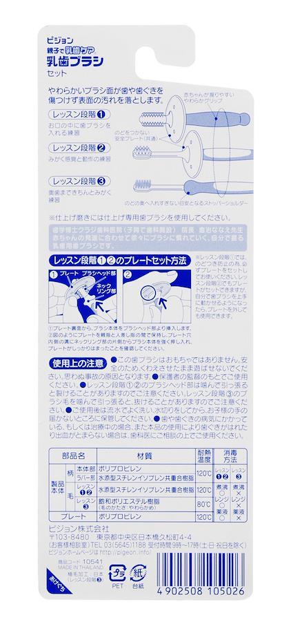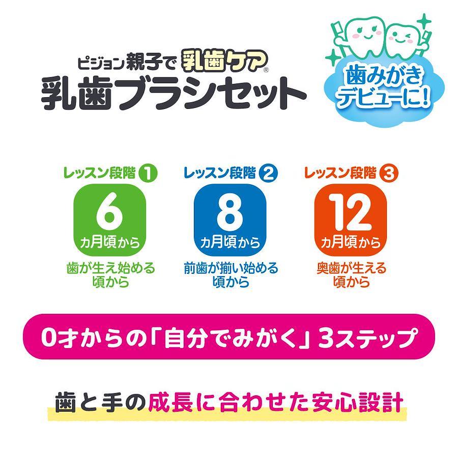 じぶんでみがくトレーニング! ピジョン親子で乳歯ブラシセット。柔らかいブラシ面が歯や歯茎を傷すけず表面の汚れを落とします。(レッスン1)歯が生え始める頃から。6~8ヶ月頃。お口の中に歯ブラシを入れる練習としてご使用ください。(レッスン2)前歯が揃い始める頃から。8~12ヶ月頃。みがく感覚と動作の練習としてご使用ください。(レッスン3)奥歯が生え始める頃から。12ヶ月頃~3才頃。奥歯まできちんと磨く練習としてご使用ください。●のど突き防止の安全プレートが形状変更によりサイズアップ、より扱いやすくなりました。※異なるパッケージの商品が届く場合がございます。