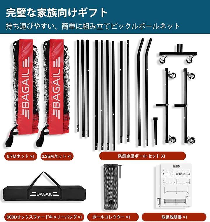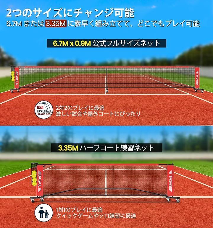 「6.7Mまたは3.35Mのピックルボールネット」 - BAGAILの最新のポータブルピックルボールネットには、フルサイズ(高さ0.9M x 幅6.7M)のUSAPA規格ネットと幅3.35Mのハーフコート練習用ネットの2つのネットが付いています。
