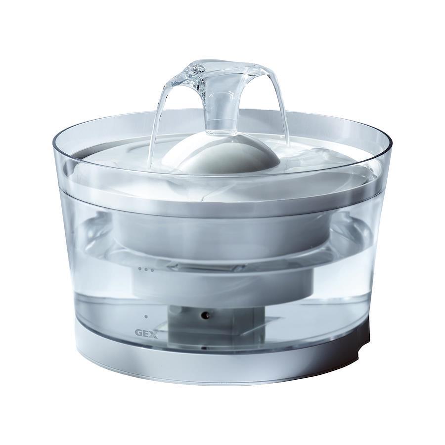 ガラスのような透明感! お手入れしやすいコードレスポンプ&タンク採用 愛猫の興味をかきたてる3通りの水流が選べる。360度どこからでも飲めるラウンドフォルム●いつでも清潔でおいしい水を ●お手入れしやすいコードレスポンプ&タンク ●ごくごく飲む!飲水量30%UP! 獣医師推奨(※第三者機関による試験より/弊社顧問獣医師の推奨となります。) ●静音設計 ●水位低下お知らせランプ&自動停止する安全設計●軟水化フィルター(全円タイプ)付き 下部尿路の健康維持に! 不織布のふわふわ線維が食べカス・抜け毛・ホコリをからめとって離さない。イオニックが、水道水のマグネシウム・カルシウムを除去してペットにやさしい軟水にし、活性炭がカルキ臭を吸着しおいしい水に。環境にやさしい植物由来プラスチック使用 [獣医師推奨]健康維持のために、お水をたくさん飲むことが大切です。キレイな水が流れるピュアクリスタルなら、飲水量がアップします。(弊社顧問獣医師の推奨となります。)■コードレスポンプ採用:タンクからコードが垂れず、お手入れしやすい。静音設計。 ■もしものときも安心:電気が止まってもファンネルにお水が残ります。 ■猫専用設計:猫の水をなめる飲み方に適したファンネル形状。好みに合わせて選べる3通りの飲み方[アタッチメント付き]。 ■360度どこからでも飲めるラウンドタイプで複数飼育にも最適 ■水位低下をランプでお知らせ&自動停止する安全設計 ■安心安全:DC5V 低電圧設計●本体サイズ:約幅23.0×奥行23.0×高さ14.5cm●電源コード長:約1.5m●最大水容量:約1.5L●適合ポンプ型番:P-12●定格電圧/電流/消費電力:DC5V 0.5A 2.0W●アダプター使用時の消費電力:AC100V 2.3W●流量:2.0L/分●使用アダプター(別売):USBアダプターG-1A 入力:AC100V 出力:DC5V 1A ※本製品にはUSBアダプターは付属していません!当社純正品(USBアダプター G-1A)もしくは市販のUSBアダプター(DC5V/1A以上)をお買い求めください。