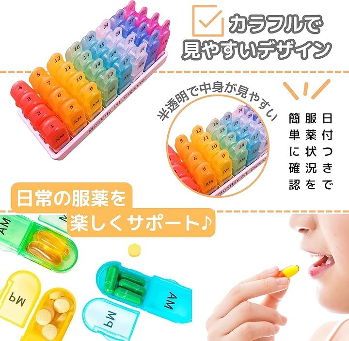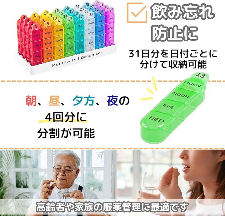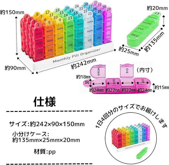 「1日4回の朝昼夕夜管理に」31日分を日付ごとに分け、さらに予備1日分も備えた朝/昼/夕/夜の4回分ピルケースです。