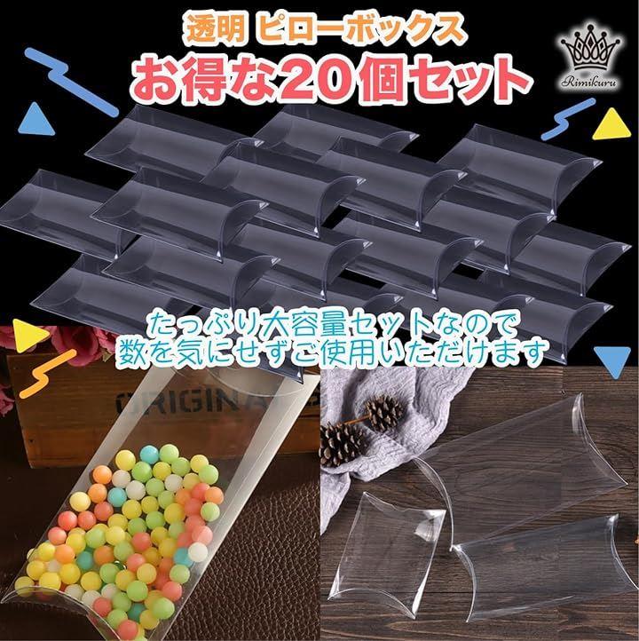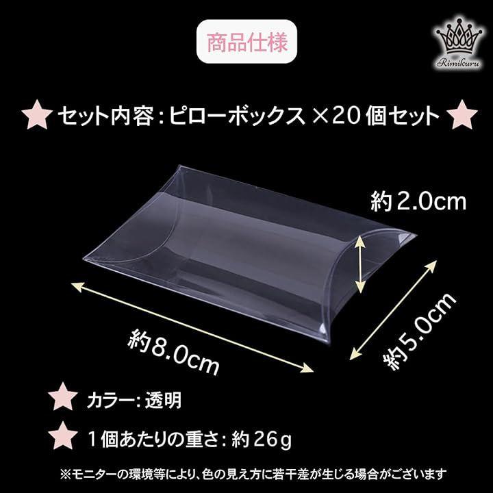 「商品仕様」セット内容:ピローボックス x20個セット サイズ:約8.0cmx約5.0cmx約2.0cm カラー:透明 1個あたりの重さ:約26g *モニターの環境等により、色の見え方に若干差が生じる場合がございます。