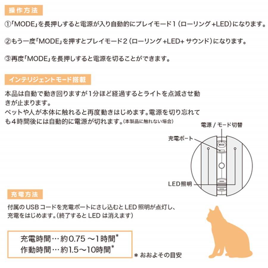 自動で動く楽しいおもちゃ♪ 遊びは猫ちゃんの狩猟本能を満たし、体の健康維持をサポートしてくれる大切な手段です。 猫ちゃんのストレス解消! 運動不足解消に! 飽きずに遊んでくれます。 ■サイズ: 9×9×23cm、ボール直径9cm ■重さ: 175g ■材質: ABS・PP ■Made in: CHINA ■操作方法■ (1)「MODE」を長押しすると電源が入り自動的にプレイモード1(ローリング+LED)になります。 (2)もう一度「MODE」を押すとプレイモード2(ローリング+LED+サウンド)になります。 (3)再度「MODE」を長押しすると電源を切ることができます。 ■インテリジェントモード搭載■ 本品は自動で動き回りますが1分ほど経過するとライトを点滅させ動きが止まります。 ペットや人が本体に触れると再度動きはじめます。電源を切り忘れても4時間後には自動的に電源が切れます。(本製品に触れない場合) ■充電方法■ 付属のUSBコードを充電ポートにさし込むとLED照明が点灯し、充電をはじめます。(終了するとLEDは消えます) 充電時間…約0.75~1時間 作動時間…約1.5~10時間 ■バッテリー:リチウムポリマー(3.7V、300mAh) ■ファンタジーローリングタンブラー専用羽パーツもご用意しております。(別売) ※注意※ ・本品はペット用です。子供のおもちゃではありません。 ・ペットのサイズや環境・性格に応じておもちゃを選んでください。 ・おもちゃを飲み込む恐れのあるペットには使用しないでください。 ・本品を分解しないでください。内部には小さい部品があるため、誤飲した場合窒息や腸閉塞など、重篤な危険を伴います。 ・本品は必ず飼い主の監視のもとで使用をおねがいします。 ・本品に強い衝撃を与えないでください。使用前には点検をし、破損している場合は交換してください。 ・本品を使用した事による不慮の事故の責任に対して、当社はその責任を負いません。