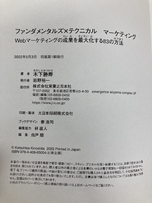 ■商品詳細■ 商品名・ファンダメンタルズ×テクニカル マーケティング Webマーケティングの成果を最大化する83の方法 実業之日本社 木下 勝寿/ ■商品状態■表紙にスレ、ヤケ、ヤブレ、天地小口にスレ、ヤケ、シミ、本にスレ、ヨレ、ヤケ、があります。本を読むことに支障はございません。※注意事項※■毎商品チェック後出品しておりますが、中古品ということもあり、多少の書き込み等のチェック漏れがあった際はご容赦下さい。■付録等の付属品がある商品の場合、記載されていない物は『付属なし』とご理解下さい。■併売販売をしているため、在庫切れの場合はキャンセルとなります。予めご了承ください。