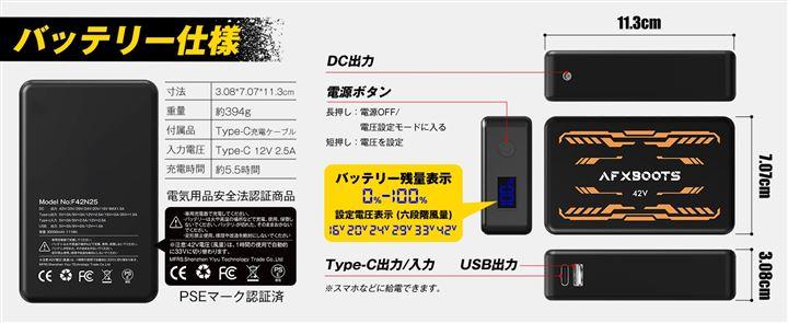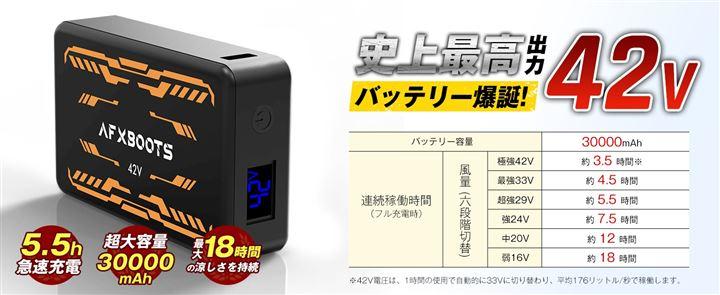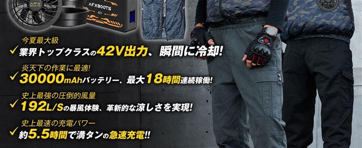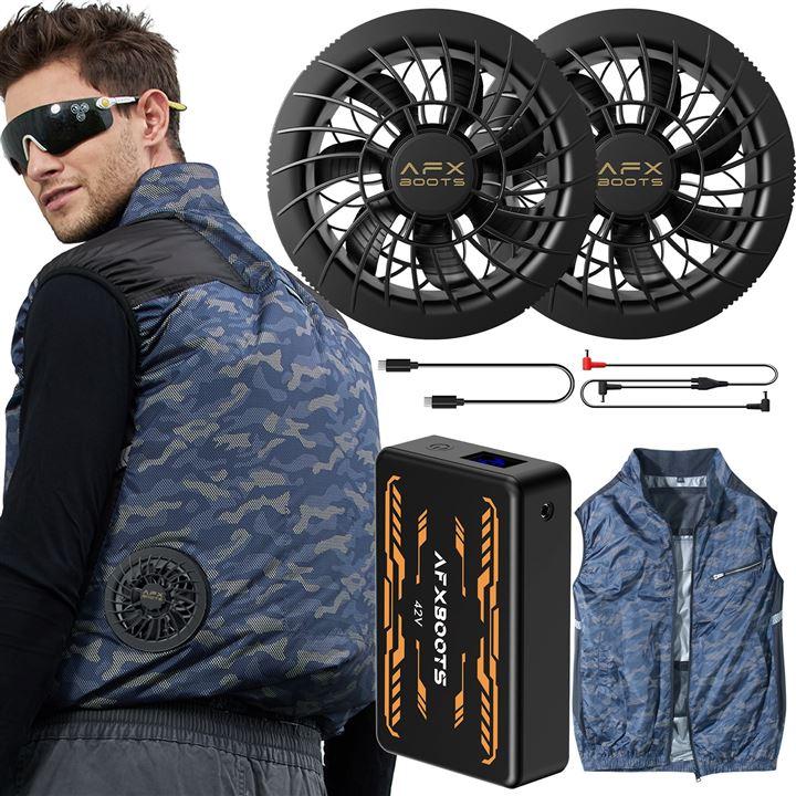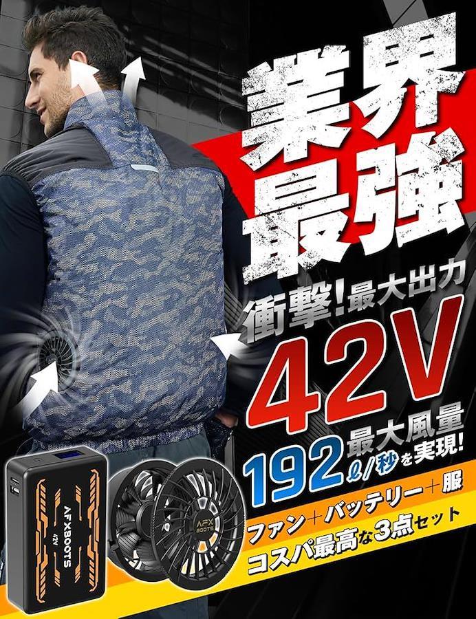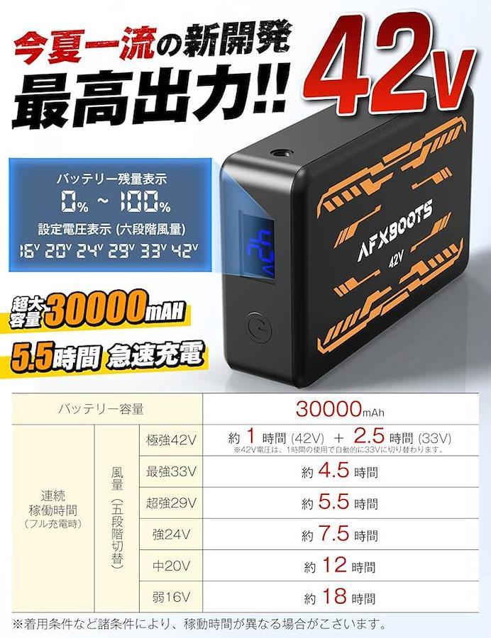 「42Vファン付きベスト」・最高出力42V。・最大風量192L/S。・最大回転数8900RPM。・30000mAh超大容量バッテリー付。・5.5時間急速充電。・-5℃遮熱効果ベスト。
