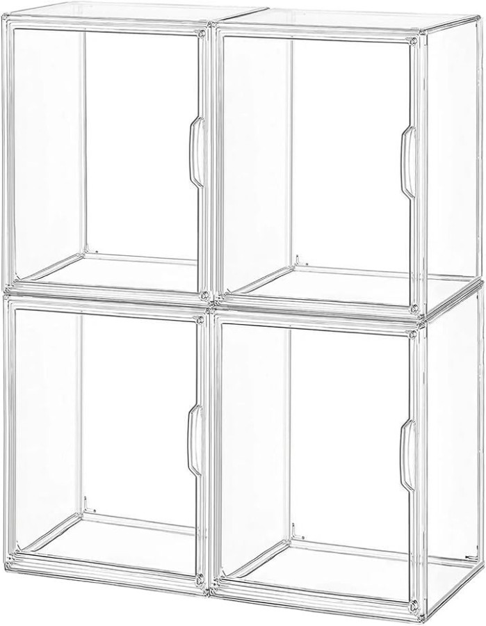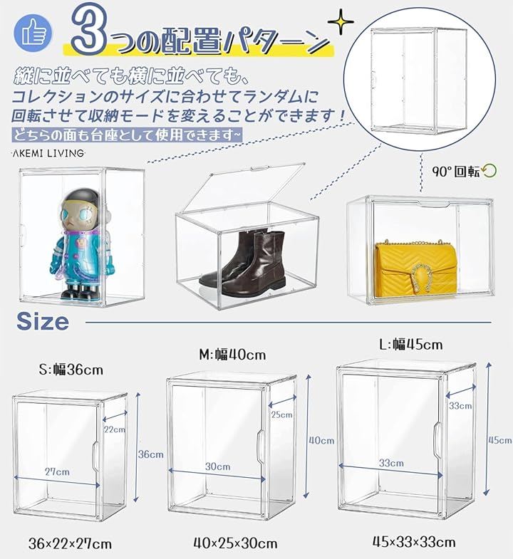 サイズ:36(幅)x22(奥行き)x27(高さ)cm、セット:4個入り、素材:高透明PET材質、場所をとらず小型/大型のフィギュア、模型を展示するのにちょうどよいサイズ。