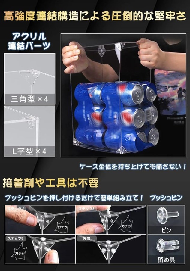 「高強度連結構造」次世代フィギュアケースの登場です。衝撃や揺れでも崩れない三角コネクタ構造により堅牢性を実現。
