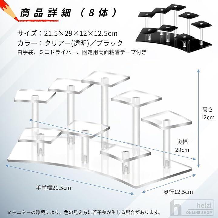 「商品詳細」サイズ(手前幅・奥幅・高さ・奥行) 5体:12x19x8x11.5cm 8体:21.5x29x12x12.5cm 10体:15.5x29.5x14x17.7cm カラー:各クリアー(透明)/ブラック 白手袋、ミニドライバー、固定用両面粘着テープ付き