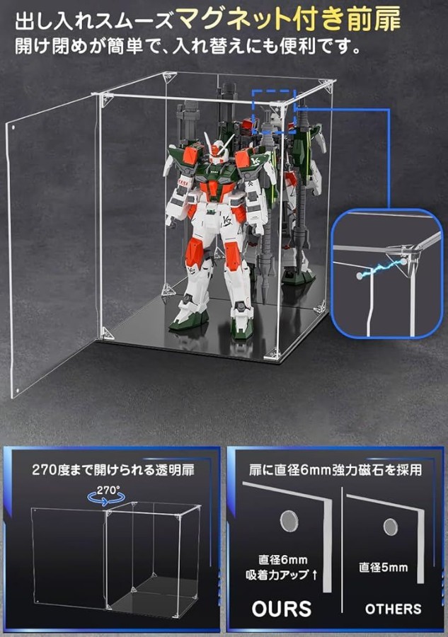 「マグネット付きの扉」マグネットドア構造により開閉が簡単に行えるため、コレクションの出し入れのためにアクリルケースを分解する必要がありません。