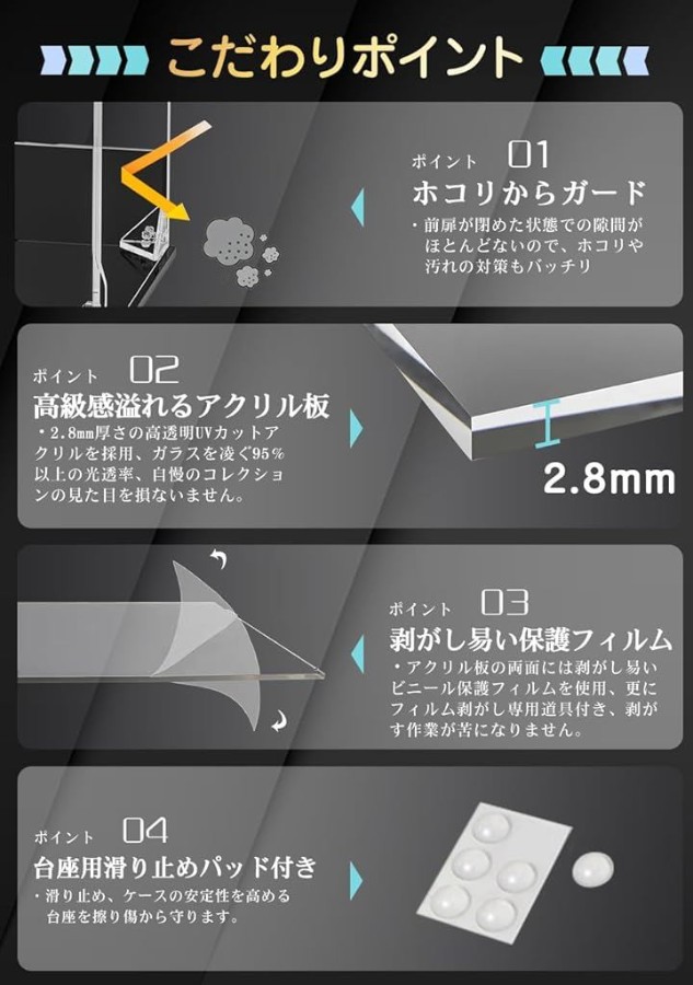 「高強度連結構造」次世代フィギュアケースの登場です。衝撃や揺れでも崩れない三角コネクタ構造により堅牢性を実現。