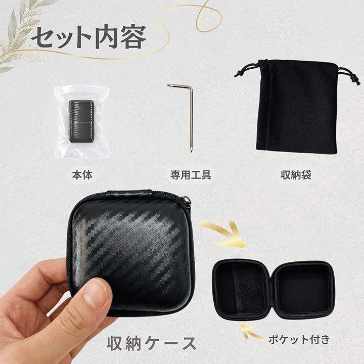 手のひらに収まるコンパクトサイズ(28x45x16.5mm)で、ポケットやカバンに入れて持ち運びやすい設計です。