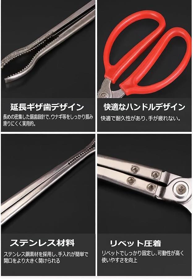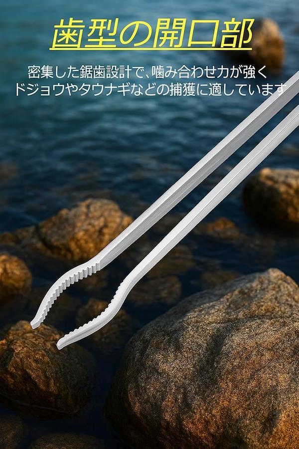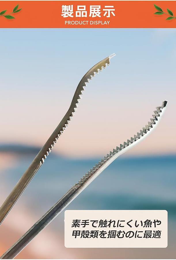 「強力グリップで滑りにくい」 先端は湾曲+細かいギザギザ加工を施し、魚・カニ・エビ・アナゴなど滑りやすい海産物をしっかり掴みます。