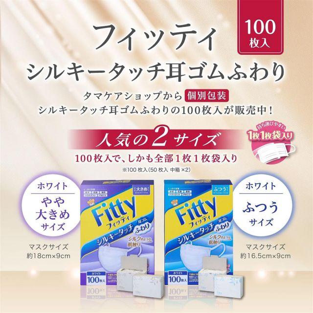 スタイル:やや大きめ(約18cm×9cm)◆商品名:[フィッティ]fittyシルキータッチ耳ゴムふわり100枚(やや大きめサイズ/不織布/50枚×2箱)個包装不織布マスク(耳が痛くなりにくい/肌ざわりがいい/大きめ)使い捨て
