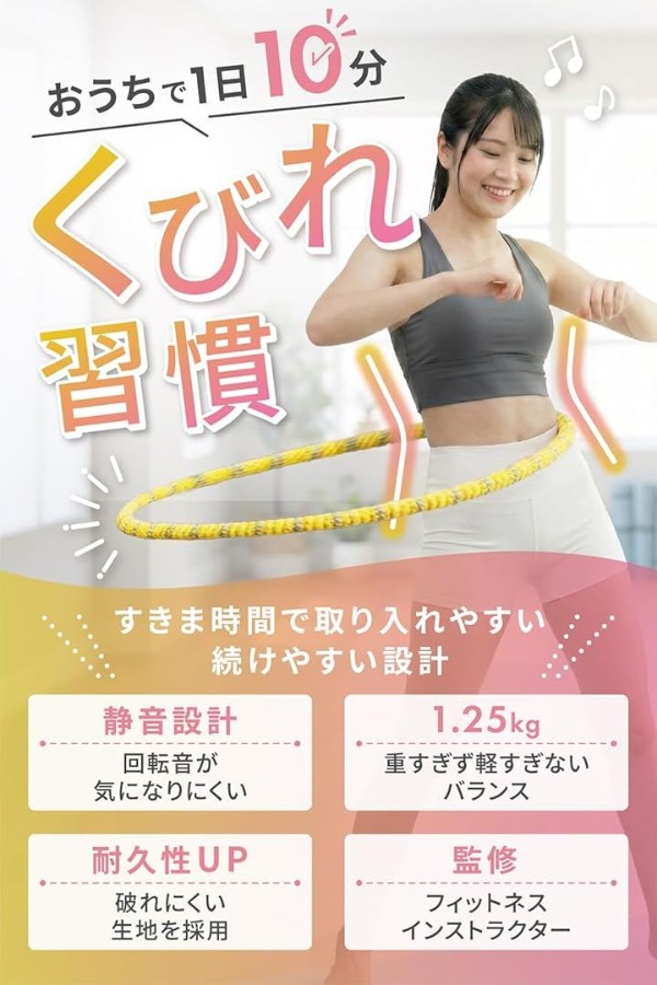 フラフープを落とさないよう踏ん張る姿勢は体幹を鍛え、フープを拾い上げる動作は「効果的なスクワット」になります。