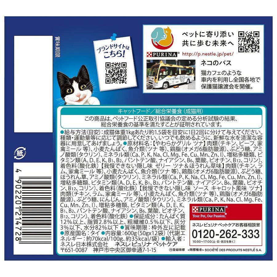 やわらかくほぐしたツナのうまみをジューシーなゼリー、風味豊かな隠し味ゼリー、食欲そそる隠し味ソースの3種類のバラエティでネコさん飽きさせない!やわらかグリル ツナ・我慢できない隠し味ゼリー ツナ&ほうれん草味・我慢できない隠し味ソース ツナ キャロット風味ソース 各4袋が入ったバラエティパック原材料1:【やわらかグリル ツナ】肉類(チキン、ビーフ、家禽ミール 等)、小麦たんぱく、魚介類(ツナ 等)、鶏脂(オメガ6脂肪酸源)、ぶどう糖、アミノ酸類(タウリン)、ミネラル類(Ca、P、K、Na、Cl、Mg、Fe、Cu、Mn、Zn、I)、増粘多糖類、ビタミン類(A、D、E、K、B1、B2、パントテン酸、ナイアシン、B6、葉酸、ビオチン、B12、コリン)、着色料(酸化鉄) 【我慢できない隠し味 ゼリー ツナ&ほうれん草味】肉類(チキン、ラム、家禽ミール 等)、小麦たんぱく、魚介類(ツナ 等)、鶏脂(オメガ6脂肪酸源)、ぶどう糖、ほうれん草、アミノ酸類(タウリン)、ミネラル類(Ca、P、K、Na、Cl、Mg、Fe、Cu、Mn、Zn、I)、増粘多糖類、ビタミン類(A、D、E、K、B1、B2、パントテン酸、ナイアシン、B6、葉酸、ビオチン、B12、コリン)、着色料(酸化鉄)原材料2:【我慢できない隠し味 ソース キャロット風味 ツナ 】肉類(チキン、ラム、家禽ミール 等)、小麦たんぱく、魚介類(ツナ 等)、鶏脂(オメガ6脂肪酸源)、ぶどう糖、にんじん、アミノ酸類(タウリン)、ミネラル類(Ca、P、K、Na、Cl、Mg、Fe、Cu、Mn、Zn、I)、増粘多糖類、ビタミン類(A、D、E、K、B1、B2、パントテン酸、ナイアシン、B6、葉酸、ビオチン、B12、コリン)、着色料(酸化鉄)保証成分:たんぱく質:12%以上、脂質:2.8%以上、粗繊維:0.5%以下、灰分3%以下、水分82%以下