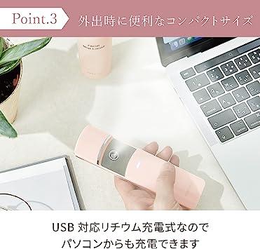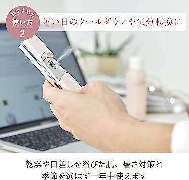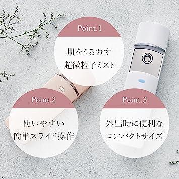 通常1-5営業日で発送:?【超微粒子ミストで肌を整えながら、気分までリフレッシュ】メイクをしている上からでも肌表面を濡らさず、うるおいチャージ。乾燥が気になる肌や日差しを浴びた肌、暑さ対策と、季節を選ばず一年中使えます。?【いつでもどこでも、簡単うるおいチャージ】持ち運べるハンディミストは1回の充電(約2時間)で、1回約10秒使用した場合でも約20回使用可能。 ※タンク9ml満水の場合?【使いやすいスライド操作】本体カバーをスライドするだけで瞬時にミスト噴射。連続約50秒噴射で自動オフの安心設計。?【衛生的な抗菌タンク】小型の抗菌タンクは本体から取り外し可能。洗って、いつでも清潔キープ。タンクに水を注ぎやすい、便利な水差しボトル付き。?【くり返し使えるUSB充電式】充電約2時間で、最大約40分使用可能。パソコンなどから充電できます。