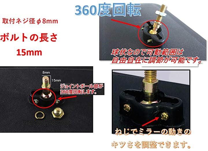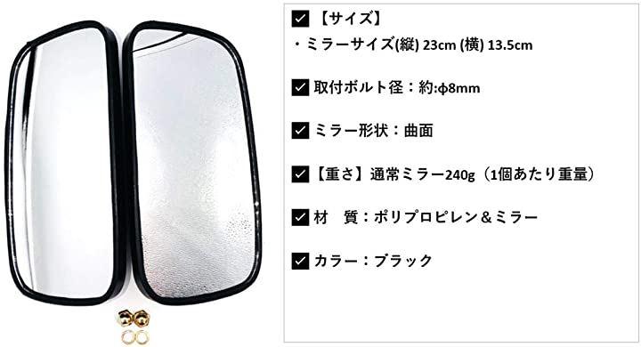 ・v サイズ:通常ミラーサイズ(縦) 230x (横)135mm の2種類 v 取付ボルト径:約:φ8mm v ミラー形状:曲面 v「重さ」特大ミラー370g(1個あたり重量) 通常ミラー重さ:240 g v 材 質:ポリプロピレン&ミラー v カラー:ブラック
