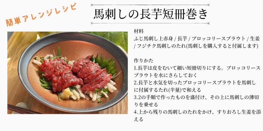 | 原材料名 | 馬肉、牛肉 馬刺しのたれ原材料:しょうゆ(国内製造)、植物性蛋白加水分解物(大豆を含む)、糖類(砂糖、砂糖混合異性化液糖)、食塩、かつお節エキス(小麦・さばを含む)/カラメル色素、調味料(アミノ酸等)、甘味料(ステビア、カンゾウ) 馬刺し生姜原材料:しょうが(国産、中国)、食塩/増粘多糖類、酸化防止剤(ビタミンC) たたきのたれ原材料:しょうゆ(国内製造)、醸造酢、砂糖、にんにく加工品、こしょう、赤唐辛子/調味料(アミノ酸等)、(一部に小麦・大豆を含む) |
