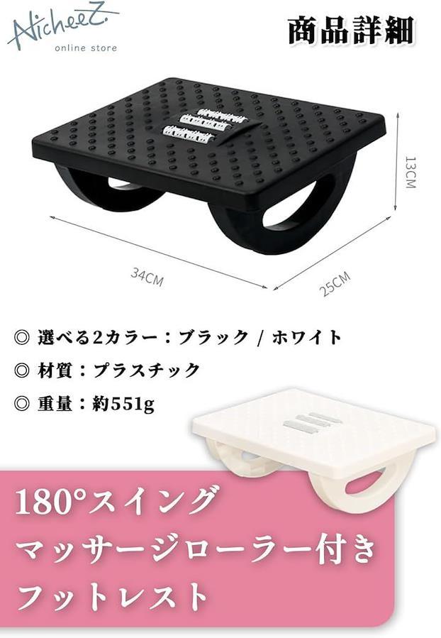 「商品内容」 180°スイングマッサージローラー付きフットレスト 材質:プラスチック カラー:ブラック/ホワイト サイズ:幅/約34cm 奥行き/約25cm 高さ/約13cm 重量:約551g