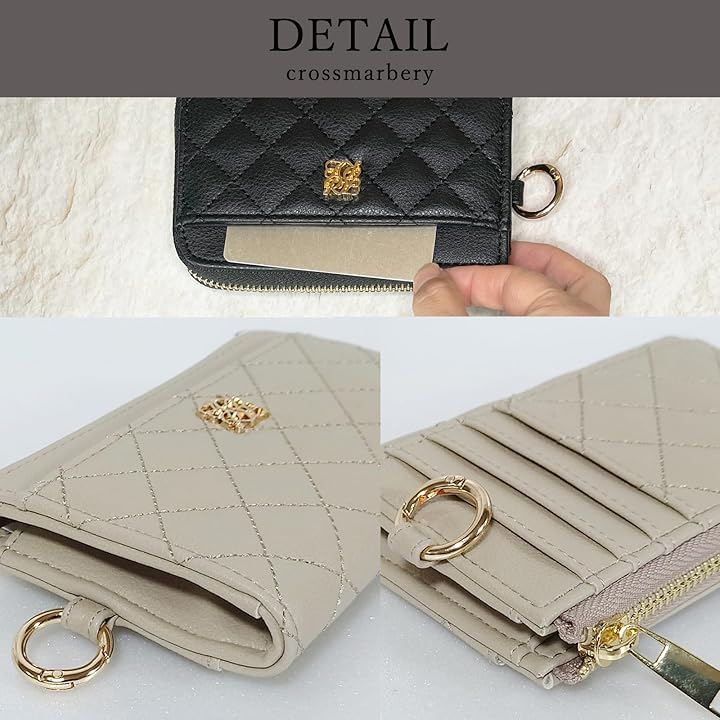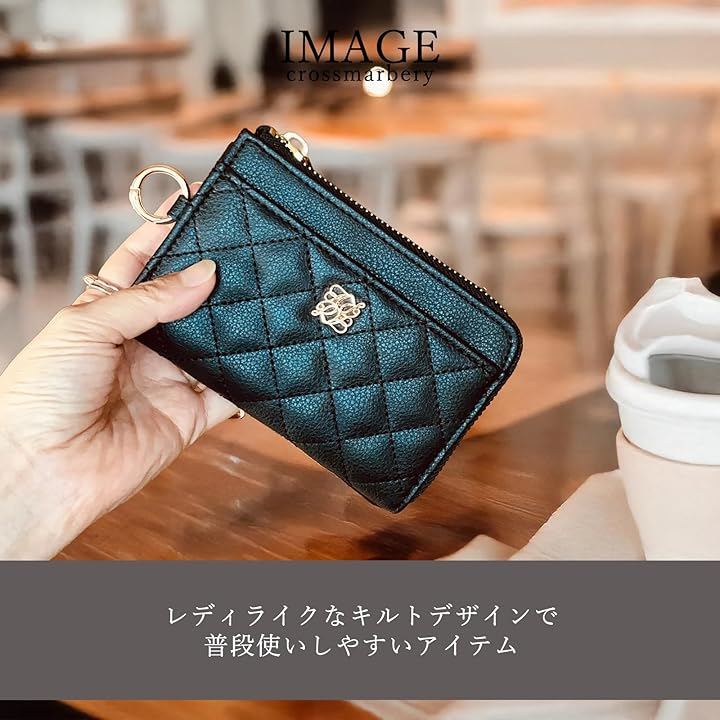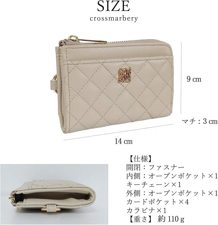 「素材」合成皮革 「仕様」開閉:ファスナー 内側:オープンポケットx1、キーチェーンx1 外側:オープンポケットx1、カードポケットx4、カラビナx1 「サイズ」横幅:14cm 高さ:9cm マチ:3cm 「重さ」約110g