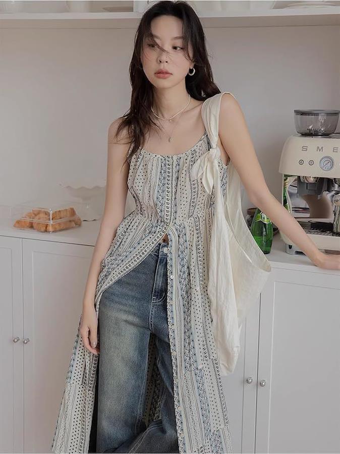 シンプルなTシャツやデニムと合わせたレイヤードスタイルがおすすめ。