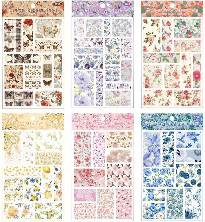 様々な種類の花々や植物が繊細に描かれた、フローラルデザインのステッカー6種セット。