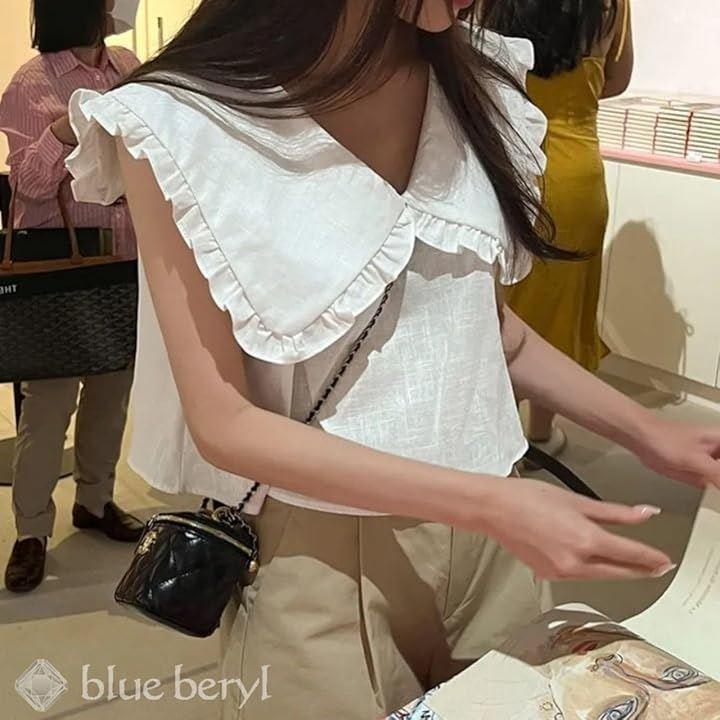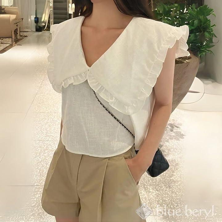 「印象的なフリル襟とバランスのよいノースリーブ」 フロントの大きめフリルカラーは、顔まわりを華やかに見せつつ小顔効果も期待。