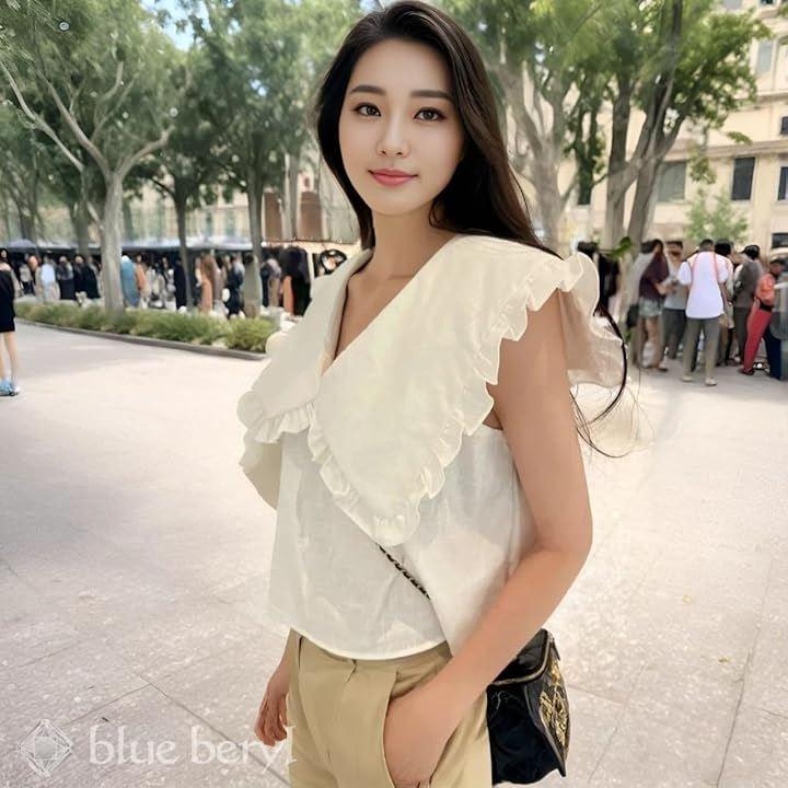 「甘さと洗練を兼ね備えたフリルカラーブラウス」 大胆に広がるフリルカラーが目を引くデザインは、フェミニンながらもモダンな印象を与える主役級の一枚。