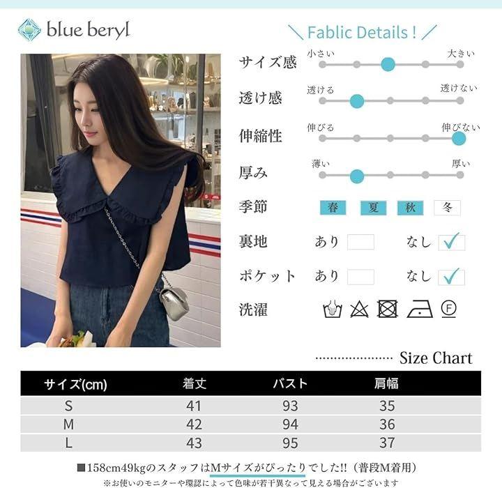 着丈/バスト/肩幅 S: 41/93/35 M: 42/94/36 L: 43/95/37 *158cm/49kgのスタッフの場合:Mがジャストサイズでした(普段M着用)