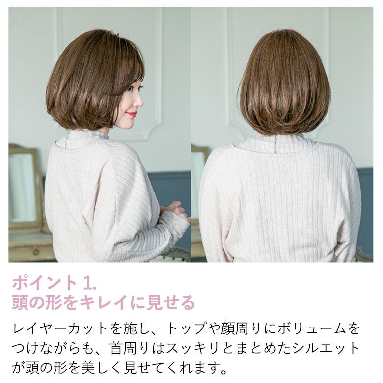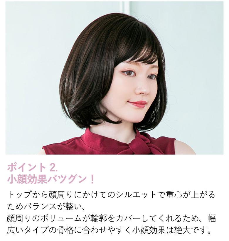 トップから顔周りにかけてのシルエットで重心が上がるためバランスが整い、 顔周りのボリュームが輪郭をカバーしてくれるため、幅広いタイプの骨格に合わせやすく小顔効果絶大。