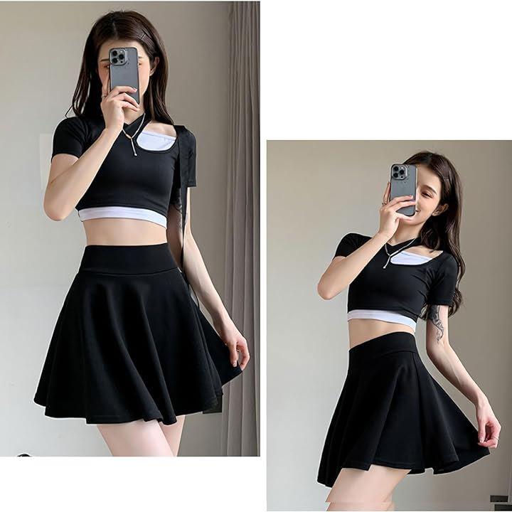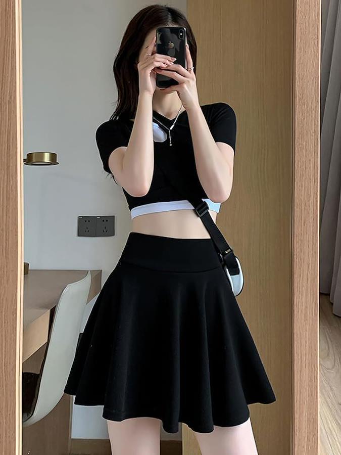 体型をキレイに見せる台形型のAラインのミニスカで、くびれを強調してキレイなシルエットを創り出し、脚をほっそりと見せるので、美脚効果も抜群。体形が気になるぽっちゃりんさんにオススメのミニ丈スカートです。